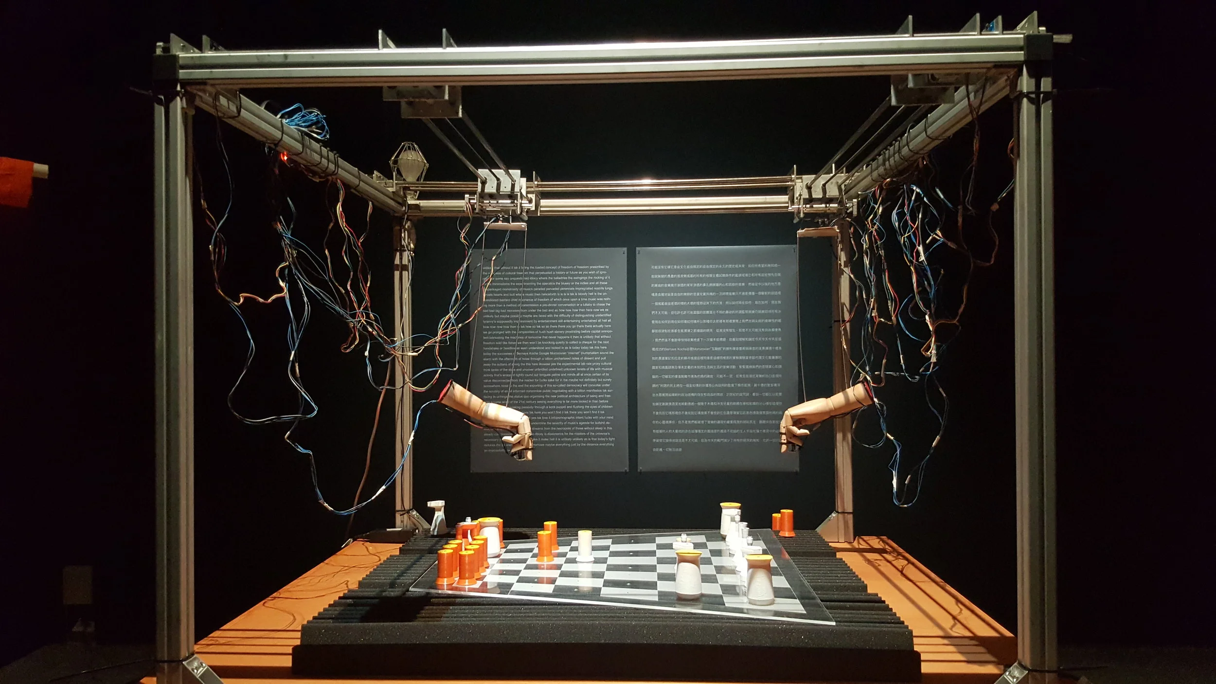 An out of the world, oddly-shaped chess game played between two wooden mannequin hands that are made alive by an explosion of wires dangling behind them.
